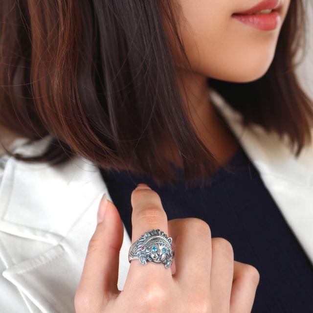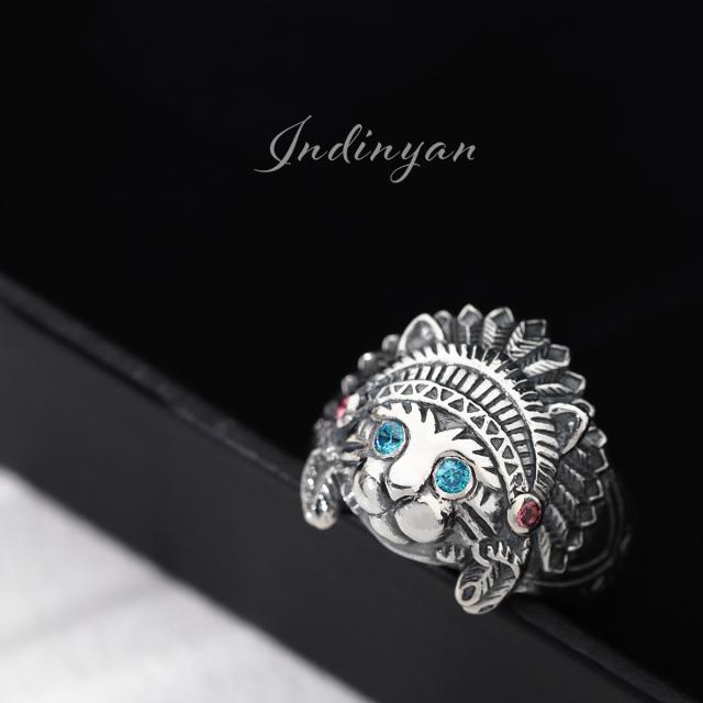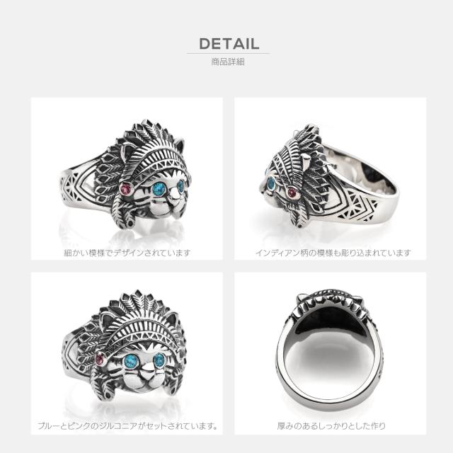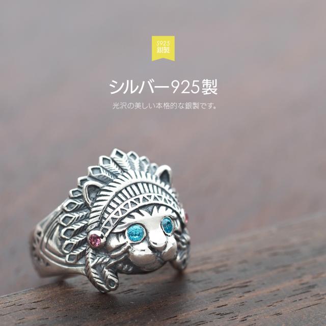 本格的なシルバー925で作られた、インディアン風猫モチーフの指輪です。インディニャン(インディアン風の猫)がモチーフで、目にブルー、髪飾りにピンクのキュービックジルコニアがセットされています。細部まで繊細に作りこまれたユニークなデザイン。ユニークな猫モチーフがアクセントとなり、装いに個性をプラス。ブルーとピンクの石が華やかさを引き立てます。猫モチーフがユニークで目を引くアイテム。特にシンプルなファッションに合わせると、リングが際立ちます。猫好きの男性にぴったりなユニークなデザイン。シルバー925の高品質素材で、長く愛用できる一品です。
