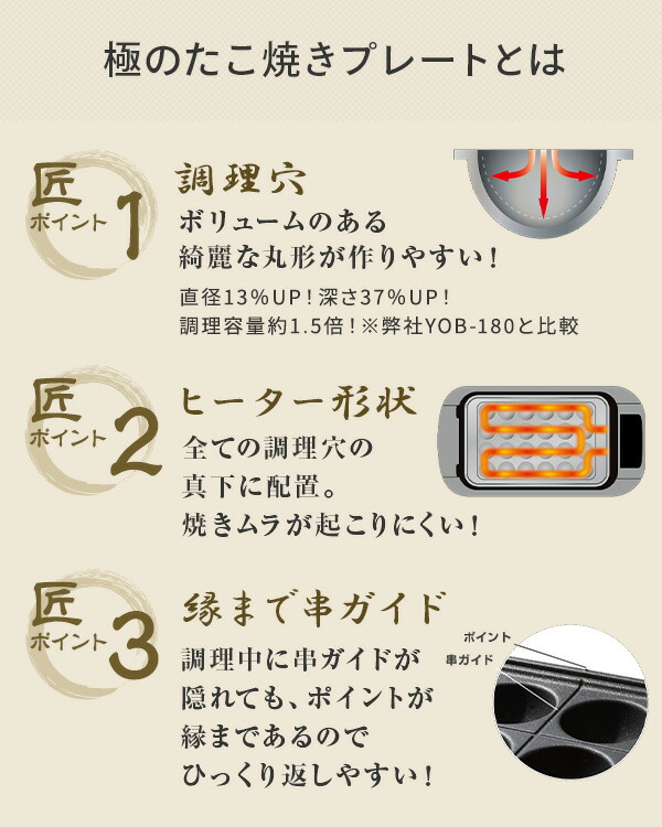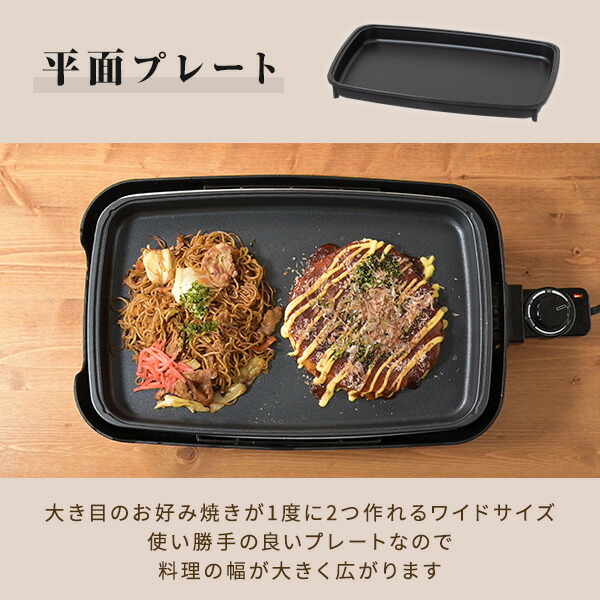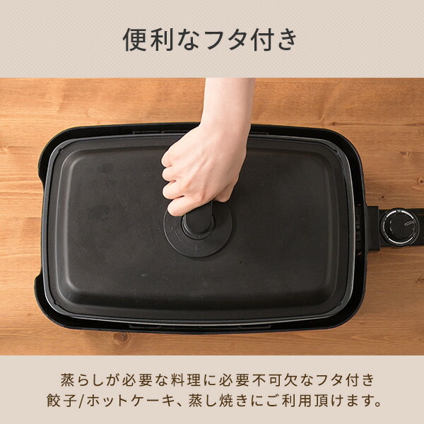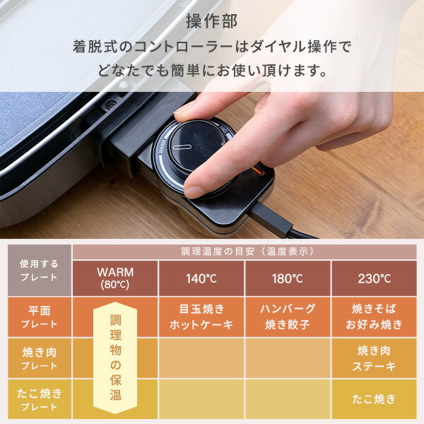 | 商品説明 | ●電源:AC100V(50/60Hz) ●消費電力:1300W ●電源コード長:2.2m ●温度調節範囲:80度(保温)〜230度 ●バイメタル式サーモスタット搭載(可変式) ●着脱式プレートでお手入れ簡単 ●温度調節はダイヤル式 ●プレート3種:平面/焼き肉/たこ焼きプレート ●焼き肉プレートは独自のXカット加工を施したプレートで調理時の煙を削減 ●焼き肉プレートなら調理中の油の飛散も油落ちを促進して削減 ●たこ焼きプレートは極のたこ焼きプレートを採用の為、大玉のたこ焼きが作れます ●蒸し焼きに便利なフタ付き ●フタは卓上でも省スペースになる自立する仕様 ●プレート、水トレイ、フタは丸洗い対応 ●付属品: ●平面プレート/焼き肉プレート/たこ焼きプレート/フタ/取っ手/水トレイ ●メーカー保証:1年間 |
