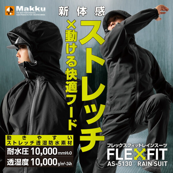 レインウェア レインコート レディース メンズ 上下 全3色 FLEX FIT RAIN SUIT 耐水圧10000mmH2O フード調節機能 AS-5130 雨合羽 カッパ 通勤通学 防水 撥水 アウトドア 軽量 フェス 上下セット 作業用 道路交通法 ヘルメット マック Makku 【送料無料】