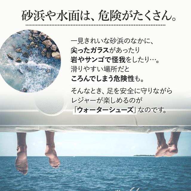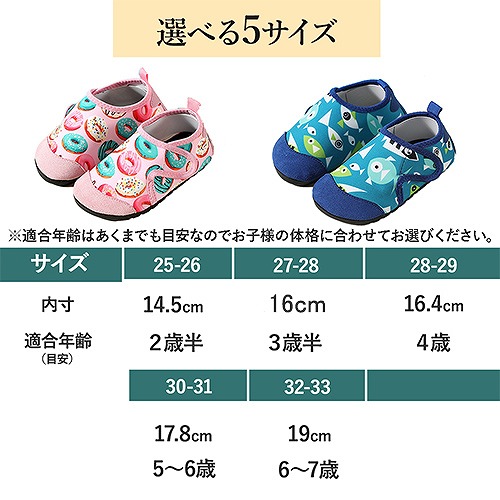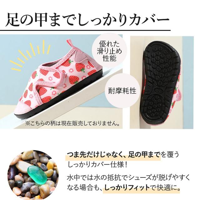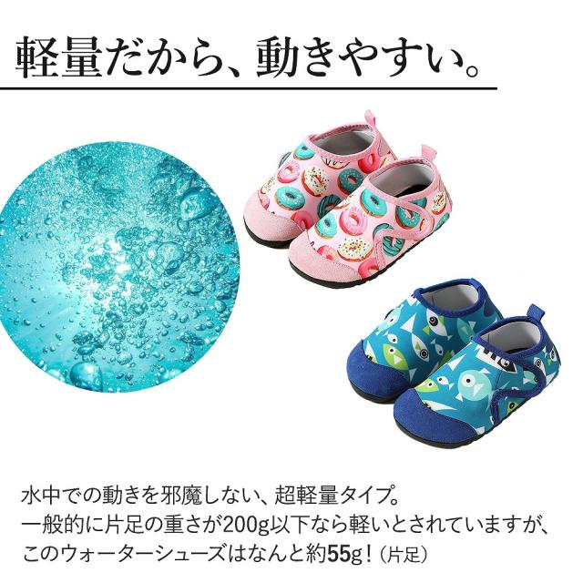 | 商品の説明 | つま先だけじゃなく、足の甲までを覆うしっかりカバー仕様! 速乾性と軽さが特徴の水陸両用シューズ。 ビーチサンダルよりも足を幅広く守ってくれるので、キャンプや散策、水辺での遊びに大活躍です。 お庭でのプール遊びにも◎ 水中では水の抵抗でシューズが脱げやすくなる場合も、しっかりフィットで快適に。 水中での動きを邪魔しない、超軽量タイプ。 一般的に片足の重さが200g以下なら軽いとされていますが、このウォーターシューズはなんと約55g!(片足) 川や海から上がったあとは、すぐに乾きやすい速乾性! 水はけがよく丈夫なので、さっと水気が切れて車内でも安心です。 豊富なカラーバリエーションと内寸14.5〜19cmのサイズ展開なので、 みんなが楽しめる快適なウォーターシューズです! |