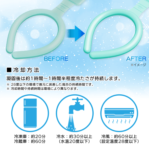 | 冷却時間の目安 | 冷凍庫:約20分 冷蔵庫:約60分 冷水:約30分以上(水温20度以下) 冷風:約60分以上(設定温度28度以下) ※ メーカー調べ |