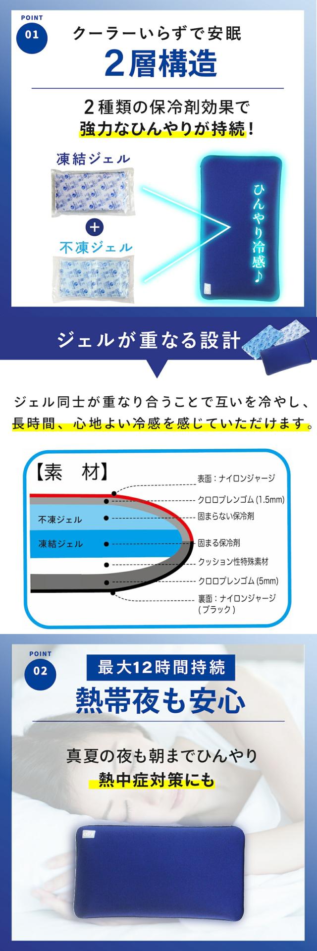不凍ジェルと凍結ジェルの2層の保冷剤+持続力を高めるクッション性特殊素材を、非常に断熱性に優れたウェットスーツ素材のクロロプレンゴムで包みこんだ、強力タイプのひんやりジェル枕です。
