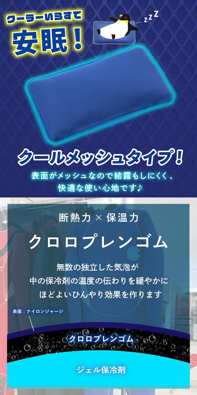 不凍ジェルと凍結ジェルの2層の保冷剤を、非常に断熱性に優れたウェットスーツ素材の3mm厚のクロロプレンゴムと、ポリウレタンメッシュで包んだ、ひんやりジェル枕です。