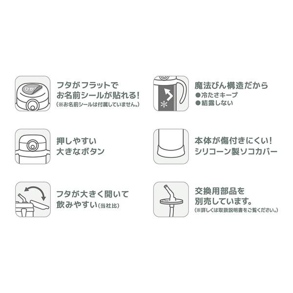 保冷専用のストローマグは、魔法びん構造だから冷たさをキープ。カチッと閉まるもれないフタや、すべりにくいソコカバーなど使いやすさを徹底しました。交換用ストローセットも付属しています。350mlの大容量タイプ。