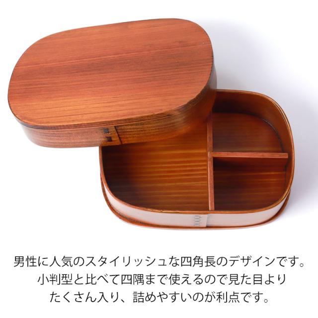 | 商品説明 | 見た目よりたくさん入る800mlの曲げわっぱです。 男性に人気のスタイリッシュな四角長のデザインです。小判型と比べて四隅まで使えるので見た目よりも沢山入り、詰めやすいのが利点です。 曲げわっぱの最大の魅力はお弁当が美味しく食べられることです。 これは木の調湿作用でご飯がベチャっとなりにくく、また通気性が良いのでお弁当の保存に適しているからです。 曲げわっぱは電子レンジ対応していませんが、電子レンジで温めなくても美味しいお弁当が食べられます。 また、食洗機対応ではございませんが、漆塗りを施していますので、手洗いで簡単に洗うことができます。 見て懐かしく、でも、今の時代にはモダンに映る「わっぱ弁当箱」手に取ると、軽くて木の温もりを感じるやさしい気持ちに。 ほのかな木の香りが心地よく、懐かしく温かい気持ちになる使い心地。 日本文化のお弁当を曲げわっぱでおしゃれに普段使いに使っていただければ幸いです。 工芸品が身近にあることで、伝統文化の継承につながればと、ささやかながら願っています。 曲げわっぱの木の調湿作用で、ごはんが冷めてもかたくなりにくく美味しく頂けるのが利点です。 自然素材の木のお弁当箱で、ゆっくりと食べるのも良いものです。 おかず仕切り付き。(仕切りは取り外し可能) |