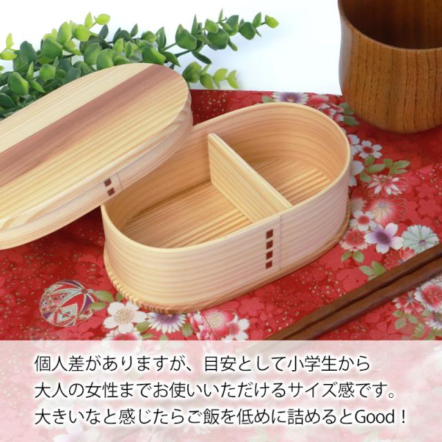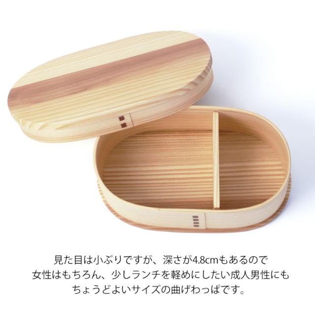見た目は小ぶりですが、深さが4.8cmもあるので女性はもちろん、少しランチを軽めにしたい成人男性にも丁度よいサイズの曲げわっぱ弁当箱です。