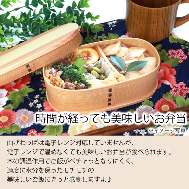 | 商品説明 | 見た目は小ぶりですが、深さが4.8cmもあるので女性はもちろん、少しランチを軽めにしたい成人男性にも丁度よいサイズの曲げわっぱ弁当箱です。 天然木製の香りがほのかに漂い、とてもリラクゼーションさせてくれます。 自然素材の木の曲げわっぱ弁当箱で、ゆっくりと食べるのも良いものですね。 天然木製の調湿作用でごはんが冷めても美味しく頂けます。 夏はごはんが傷みにくく、冬はごはんが固くなりにくく、一年を通して非常に機能性の高いお弁当箱です。 電子レンジ対応していませんが、電子レンジで温めなくても美味しいお弁当が食べられます。 また、食洗機対応ではございませんが、ウレタン塗装を施していますので、手洗いで簡単に洗うことができます。 見て懐かしく、でも、今の時代にはモダンに映る「曲げわっぱ弁当箱」手に取ると、軽くて木の温もりを感じるやさしい気持ちに。 ほのかな木の香りが心地よく、懐かしく温かい気持ちになる使い心地。 日本文化のお弁当をおしゃれに普段使いに使っていただければ幸いです。 工芸品が身近にあることで、伝統文化の継承につながればと、ささやかながら願っています。 取り外し可能なI字型の仕切りなので、付けるとご飯のスペースとおかずスペース、外せば広く使えます。 |