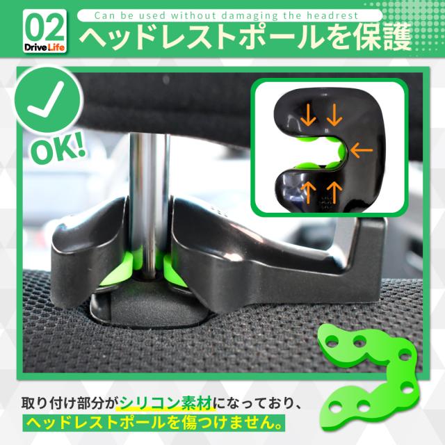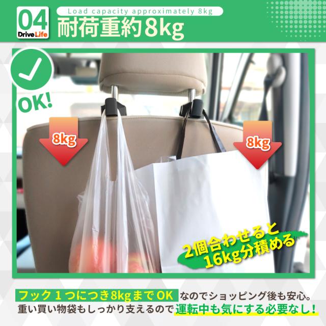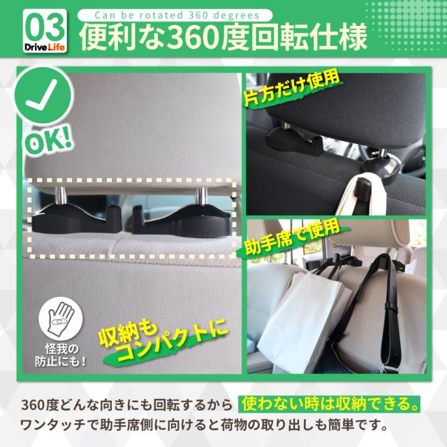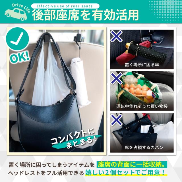 DriveLife ドライブライフ 車 フック ヘッドレスト 車 カバン フック 車 ゴミ箱 フック 車 荷物フック 車内 フック 車内 ヘッドレスト フック 2個セット 車 荷物掛け 買い物袋 レジ袋 荷崩れ防止 車 アクセサリー 便利グッズ 省スペース