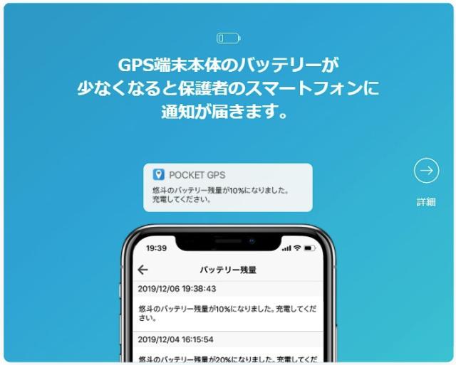 GPS端末本体のバッテリー残量が少なくなると、スマートフォンへ通知が届きます。(20%以下、10%以下の時)