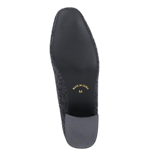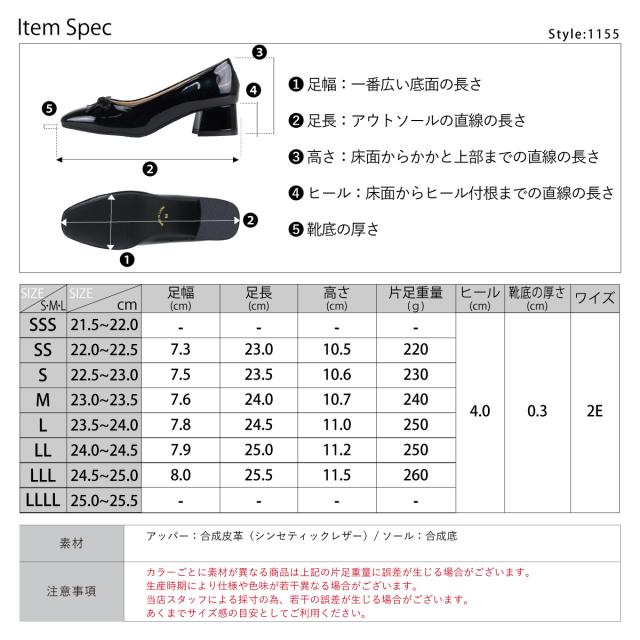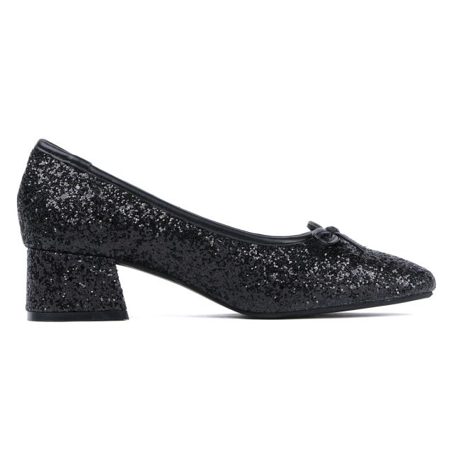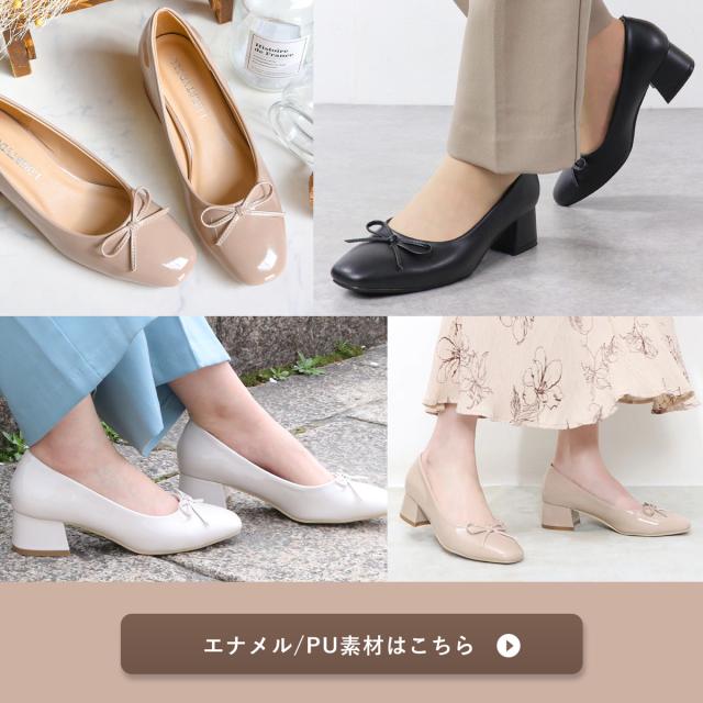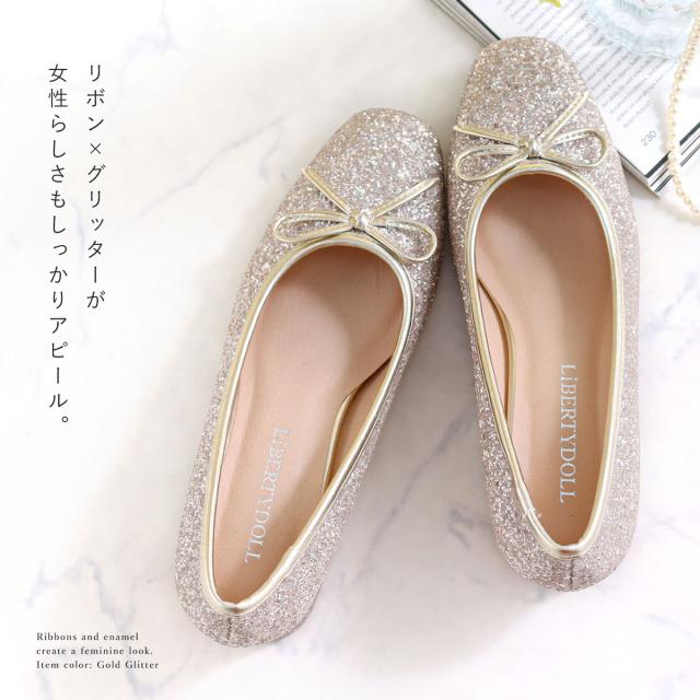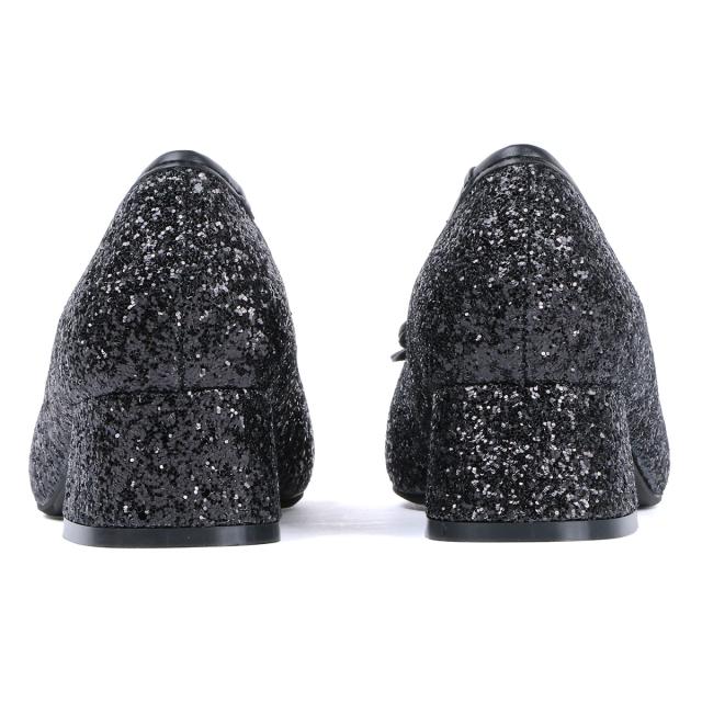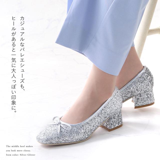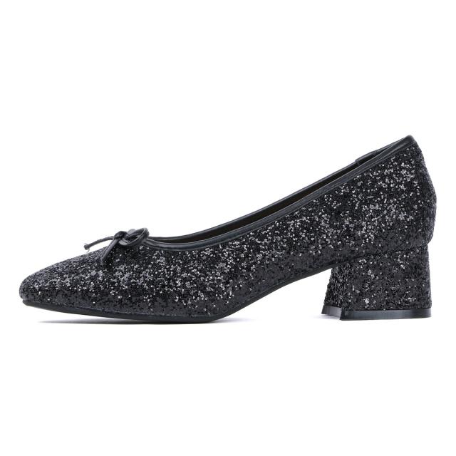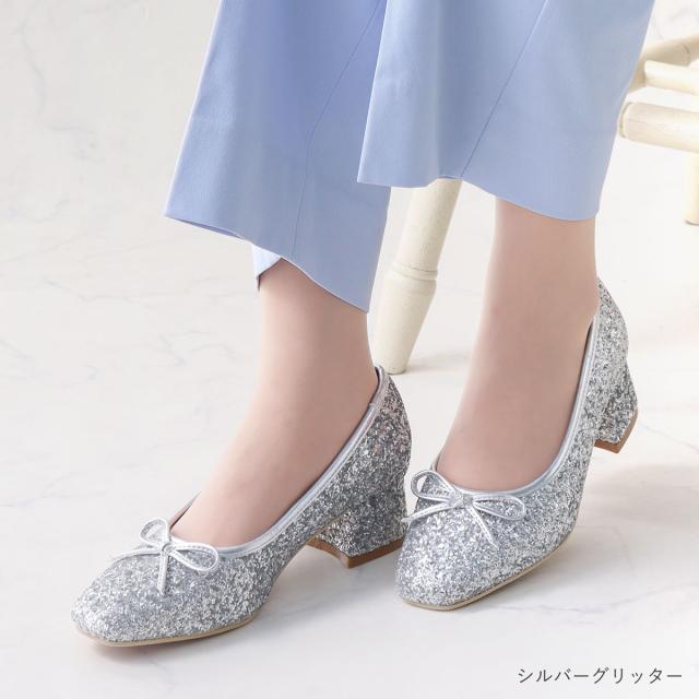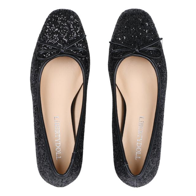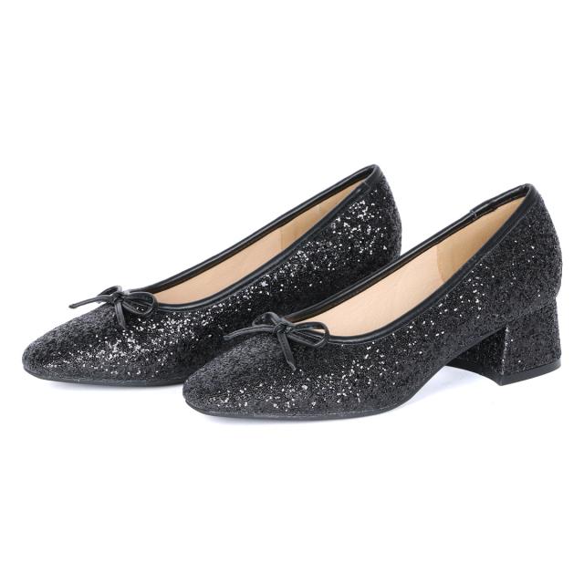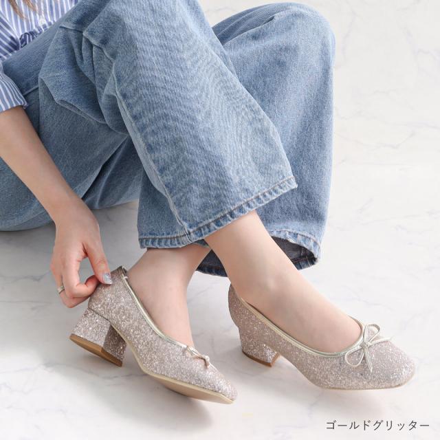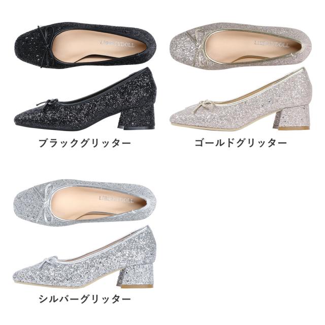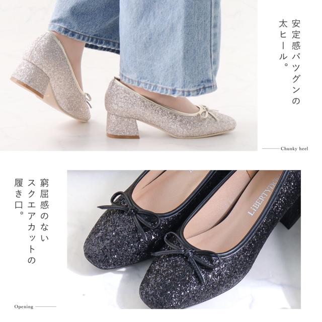 パンプス ラメ グリッター スクエアトゥ リボン チャンキーヒール バレエシューズ 4cmヒール レディース 黒 22-25cm No.1155 リバティードール