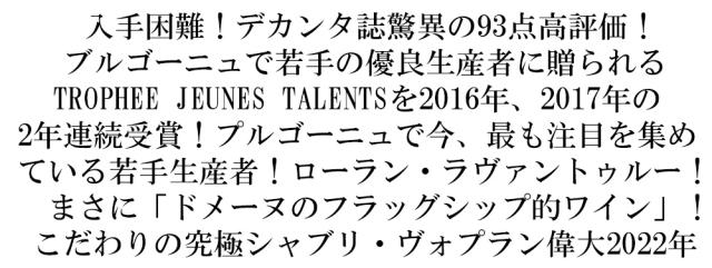 入手困難!デカンタ誌驚異の93点高評価! ブルゴーニュで若手の優良生産者に贈られる TROPHEE JEUNES TALENTSを2016年、2017年の 2年連続受賞!プルゴーニュで今、最も注目を集め ている若手生産者!ローラン・ラヴァントゥルー! まさに「ドメーヌのフラッグシップ的ワイン」! こだわりの究極シャブリ・ヴォプラン偉大2022年