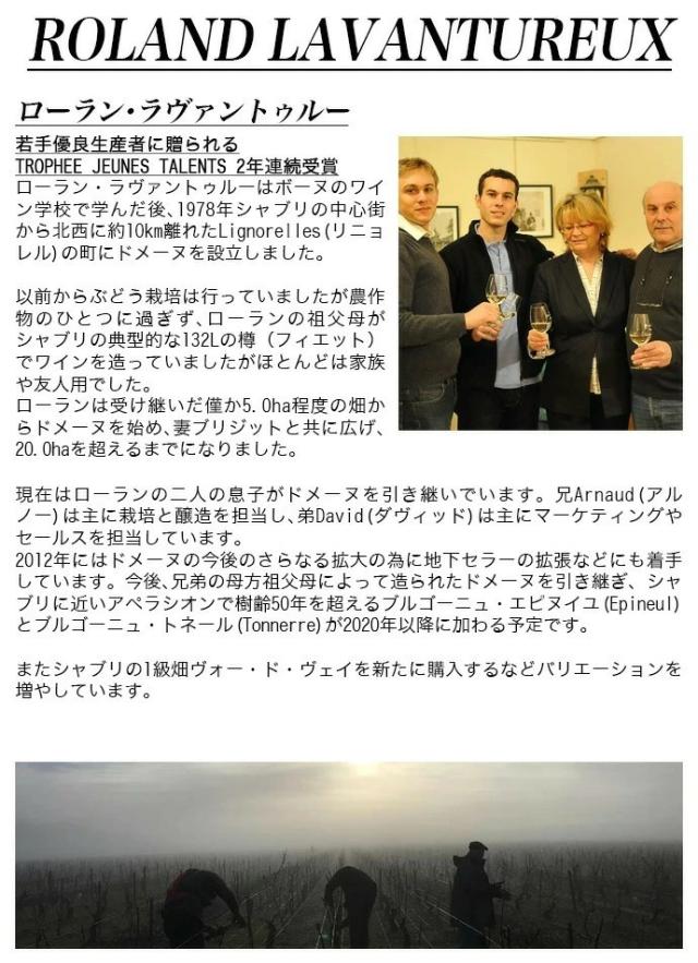 【ローラン・ラヴァントゥルー氏がボーヌのワイン学校で学んだ後、1978年シャブリの中心街から北西に約10km離れたLignorelles(リニョレル)の街にドメーヌを設立!一族では以前からブドウ栽培を行っていましたが、農産物のひとつに過ぎず、ローランの祖父母も若干のシャブリを生産していましたが、生産されたワインのほとんどは家族や友人用の自家消費用でした!ローラン氏は受け継いだ5ha程の畑からドメーヌとしてはじめ、妻ブリジットさんと共に地道に広げていき、現在では20hを超えるまでに成長!今ではローラン氏の二人の息子がドメーヌを継承!