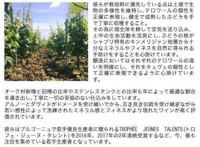 【兄アルノー氏は主に栽培と醸造、弟ダヴィッド氏は主にマーケティングやセールスを担当!兄弟がドメーヌを受け継いでから、古き良き伝統を受け継ぎながらも、若い感性によって、洗練されたミネラル感とフィネスのあるワインが高く評価!ブルゴーニュで若手優良生産者に贈られるTROPHEE JEUNES TALENTS(トロフェ・ジューヌ・タレント)を2016年に次いで2017年も2年連続で受賞するなどシャブリのみならず、プルゴーニュで今、最も注目を集めている若手生産者!