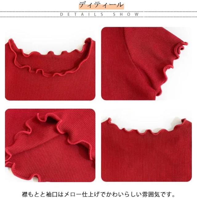 | 首回りと袖口のチューリップのようなメロウ加工がとっても可愛いトップス。 襟もとと袖口はメロー仕上げでかわいらしい雰囲気です。 伸びの良い柔らかなレーヨン素材で着心地も◎ いつものコーデにプラスするだけで大人可愛く演出できる1着♪ 1枚ではもちろん、サロペット等のインナーにしてもとっても可愛いです。 ロングシーズン使える優秀アイテムです! | |