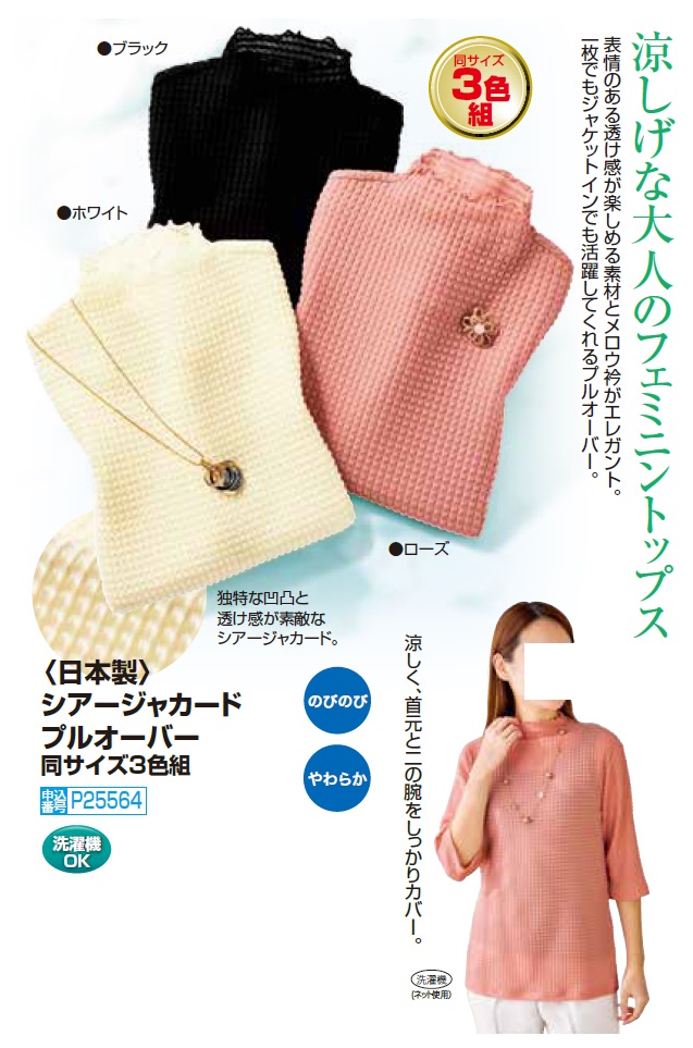 日本製 シアージャカードプルオーバー 3色組 カットソー フリル 透け感 五分袖 レディース 婦人服 ミセス シニア 女性 無地 ブラック ホワイト ピンク 黒 白 シンプル シニアファッション 40代 50代 60代 70代 80代 母の日 お母さん 春夏