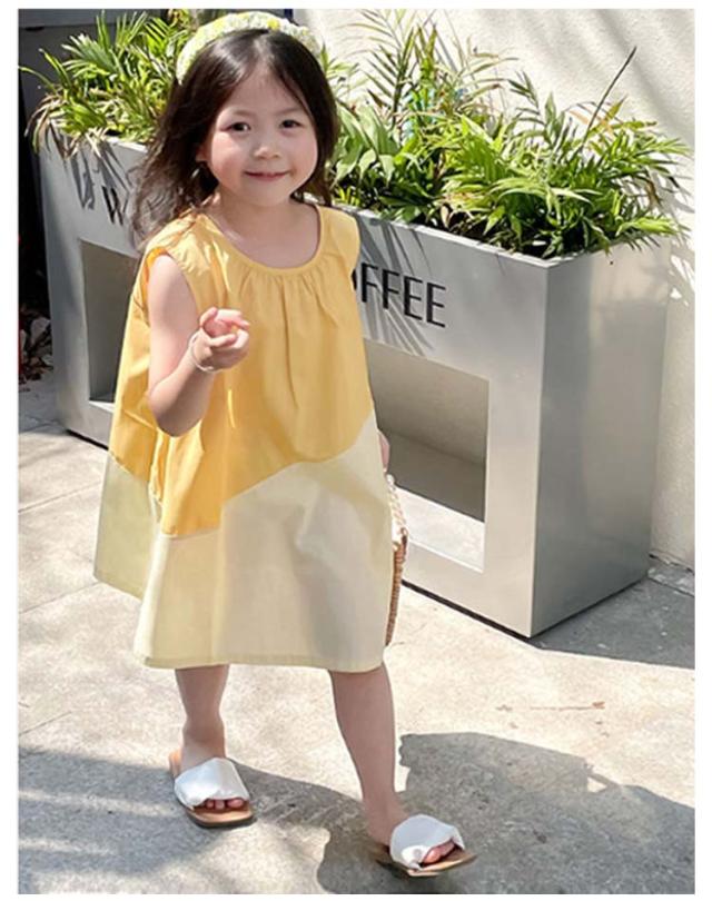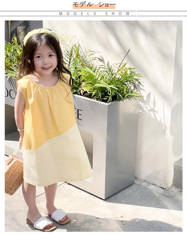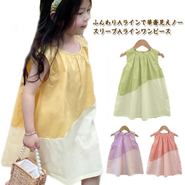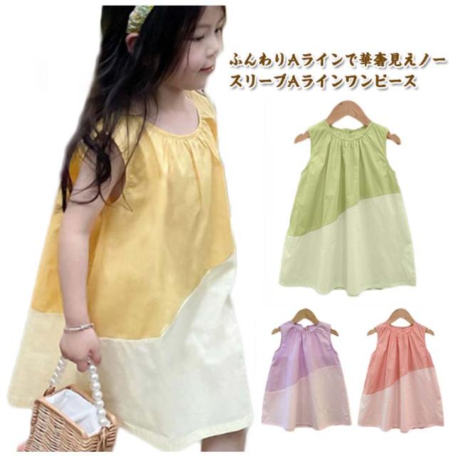 切り替え配色ワンピース 子供服 ノースリーブ Aライン ワンピース 子供ワンピース 夏 子供服 女の子 キッズ 韓国子供服 ノースリーブ 可愛い タンクワンピース フレアワンピース ワンピース キッズワンピース 切り替え配色ワンピース 送料無料 イエロー グリーン ピンク