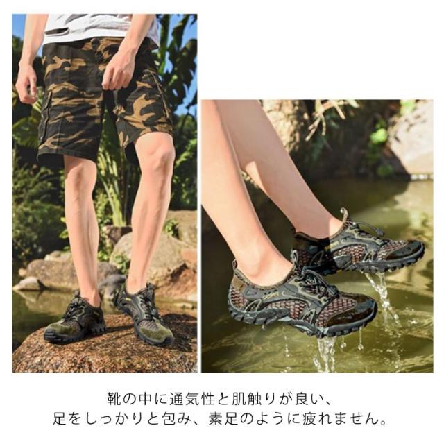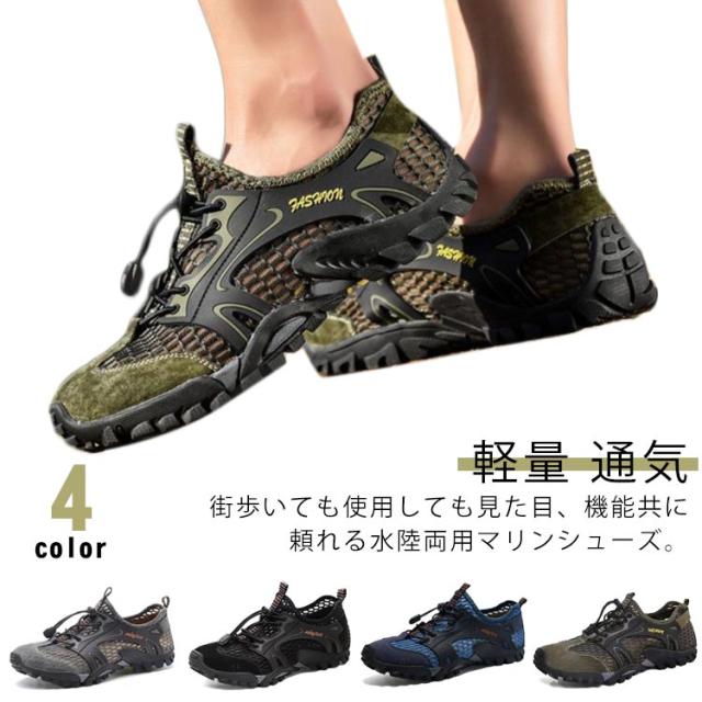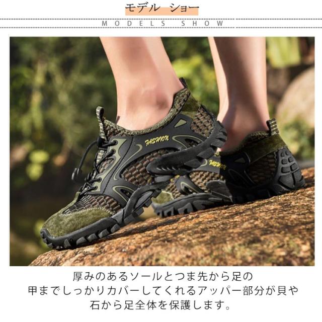 | 街歩いても使用しても見た目、機能共に頼れる水陸両用マリンシューズ。 厚みのあるソールとつま先から足の甲までしっかりカバーしてくれるアッパー部分が貝や石から足全体を保護します。 靴の中に通気性と肌触りが良い、足をしっかりと包み、素足のように疲れません。 通気性・水はけも良く、素足でもストレス無く着用いただけます。自由に走るのはより爽快で快適です。 足の幅に合わせてすぐに靴の弾性を調整し、あなたの靴を結ぶの煩わしさを避けます。 ふわっと軽くて柔らかい履き心地、滑り止めに優れたソールで気軽に海や川や登山を楽しもう!! | |