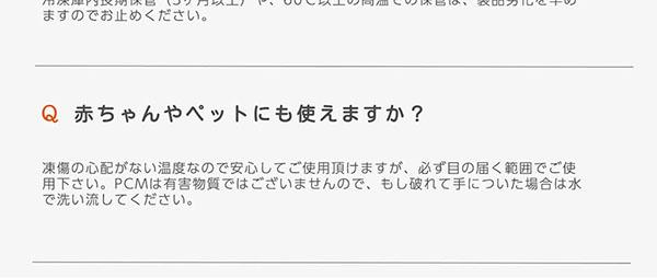 PCM材料を使用しており、28度以下で自然に凍結するため、長時間使用しても凍傷の心配がありません。