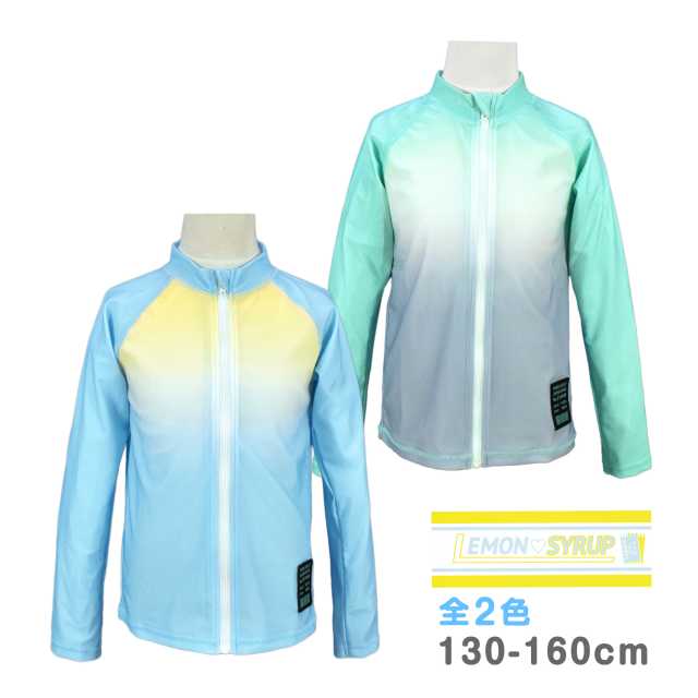 グラデーションカラー に裾チケット付きの ラッシュガード です。着脱の簡単な 前開き ファスナー。UVカット 加工で紫外線をガード。ファスナーガード付き。シンプルなデザインなのでお手持ちの水着ともコーデしやすいラッシュガードです。