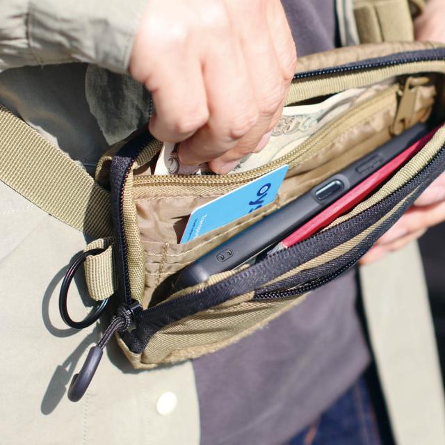 ポーチの内側と外側にファスナー付きポケットがそれぞれ1つずつ、カードポケットが4つ付いています。貴重品の収納に便利です。