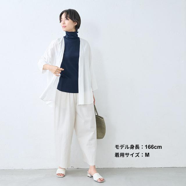 特徴 さらりと涼しい肌触りが好評の、夏の定番「強撚コットンシリーズ」に、オーガニックコットンを使用した、より薄手のフライス生地が新登場。シャリ感があり肌当たりはさらさらなタートルネックで、気になる首元をさりげなくカバーしてくれます。一枚着としても、カーディガンやジャケット、ベストやワンピースなどのインナーとしても、暑い季節の着回しに大活躍な一枚です。