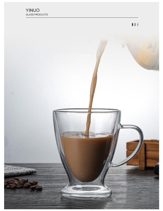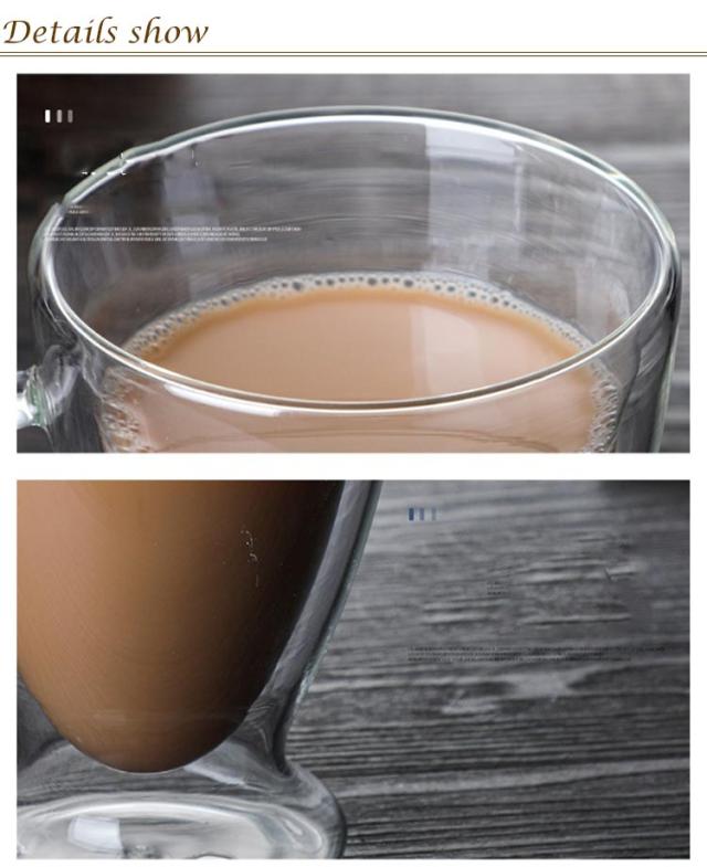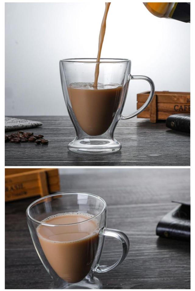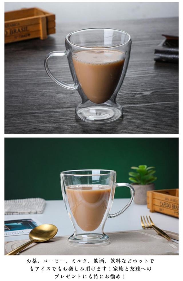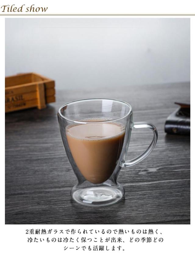 | 二重グラスマッグカップ2個セット。 2重耐熱ガラスで作られているので熱いものは熱く、冷たいものは冷たく保つことが出来、どの季節どのシーンでも活躍します。 ハンドルつき、耐熱ガラス製マグのお洒落さはそのままに「持った時の熱さ」を解消しています。 お茶、コーヒー、ミルク、飲酒、飲料などホットでもアイスでもお楽しみ頂けます!家族と友達へのプレゼントにも特にお勧め! | |