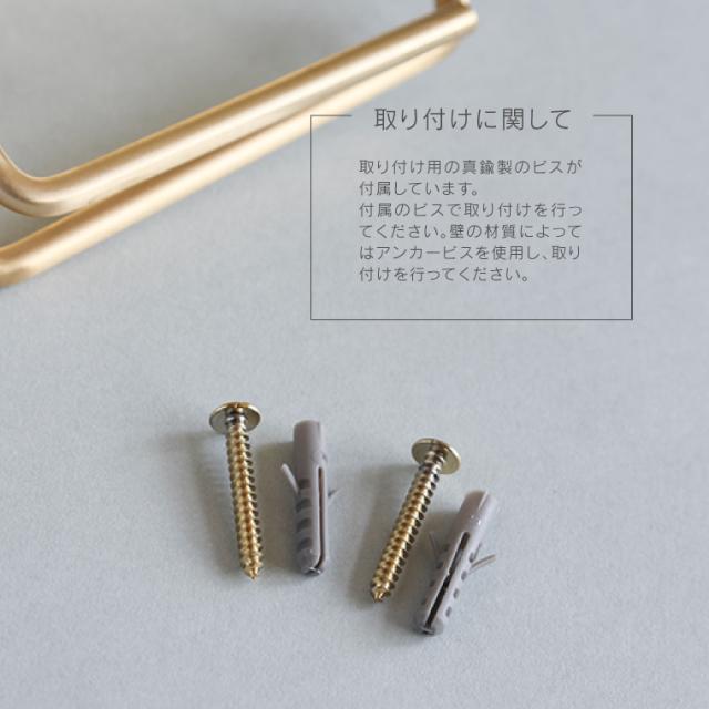 | 注意事項 | ●付属のビスで取り付けを行ってください。 ●壁の材質によってはアンカービスを使用し、取り付けを行ってください。 ●色ムラ、シミ、キズ、擦れ、色の変化、黒ずみなどによる交換・返品はできかねます。予めご了承ください。 【真鍮製品のご購入にあたって】 真鍮の素材をそのまま活かすため色むらがあったりシミのように見える場合があります。商品によって一つ一つ異なりますが、製品の特徴として、また真鍮の変わりゆくアンティーク感としてお楽しみください。 また、素手で触れた部分は変色の原因となりますので、取付けの際はご注意ください。 |