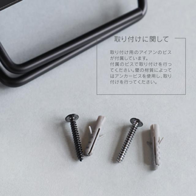 | 注意事項 | ●付属のビスで取り付けを行ってください。 ●壁の材質によってはアンカービスを使用し、取り付けを行ってください。 ●色ムラ、シミ、キズ、擦れ、色の変化、黒ずみなどによる交換・返品はできかねます。予めご了承ください。 【アイアン素材に関して】 アイアン素材は色味・質感・錆び方・溶接痕に個体差があります。少しずつ異なる風合いをお楽しみください。 ※上記理由での返品、交換はお受けできかねます。 |