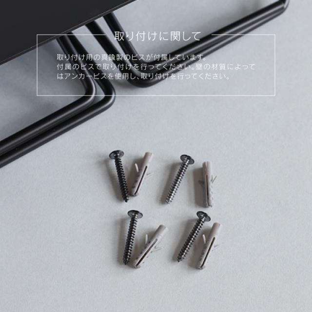 | 注意事項 | ●付属のビスで取り付けを行ってください。 ●壁の材質によってはアンカービスを使用し、取り付けを行ってください。 ●色ムラ、シミ、キズ、擦れ、色の変化、黒ずみなどによる交換・返品はできかねます。予めご了承ください。 【アイアン素材に関して】 アイアン素材は色味・質感・錆び方・溶接痕に個体差があります。少しずつ異なる風合いをお楽しみください。 ※上記理由での返品、交換はお受けできかねます。 |