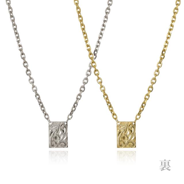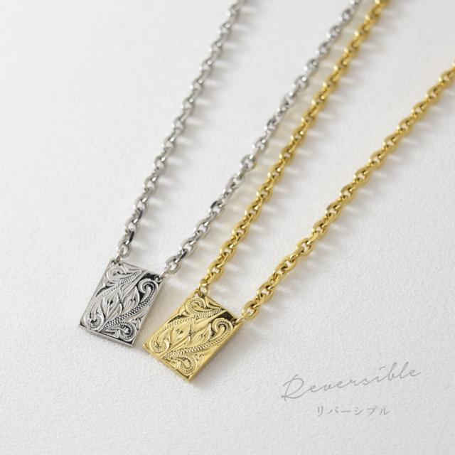スクエアデザインの聖母マリアメダイぺアネックレス。裏面には繊細なハワイアン柄を施したリバーシブルデザイン。 男性用はスティールシルバーカラー、女性用はイエローゴールドカラーの仕様です。