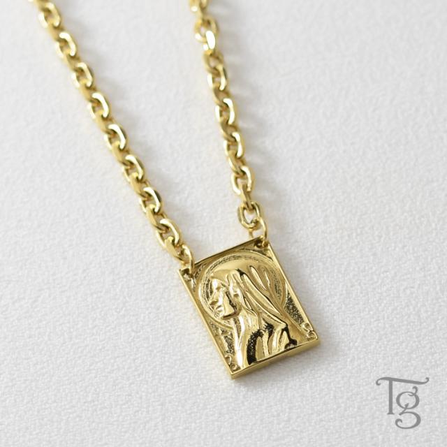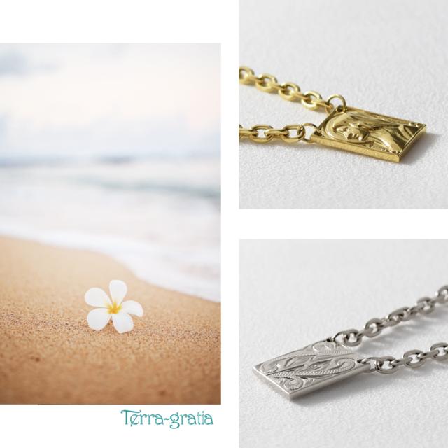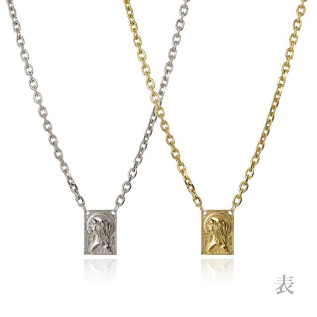 スクエアデザインの聖母マリアメダイぺアネックレス。裏面には繊細なハワイアン柄を施したリバーシブルデザイン。