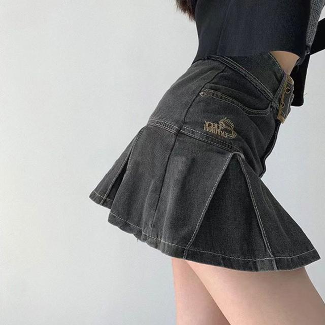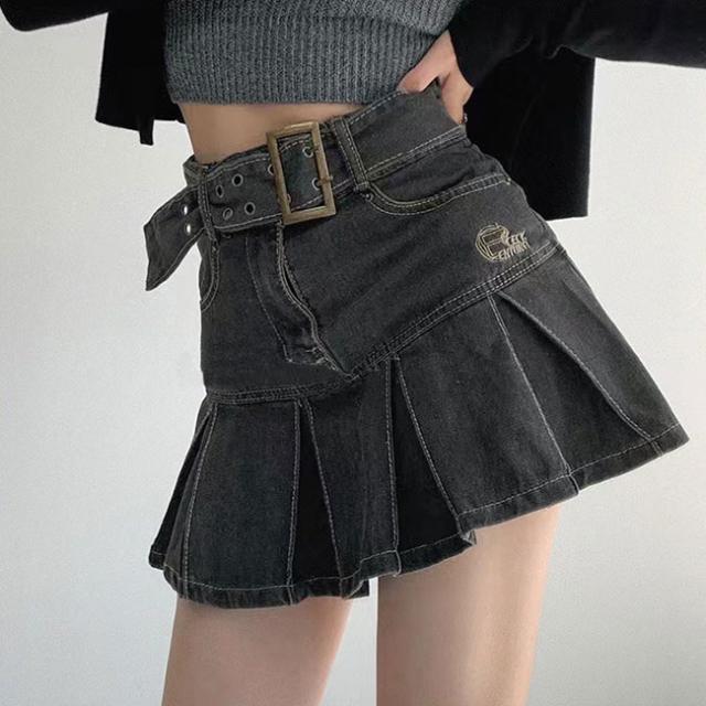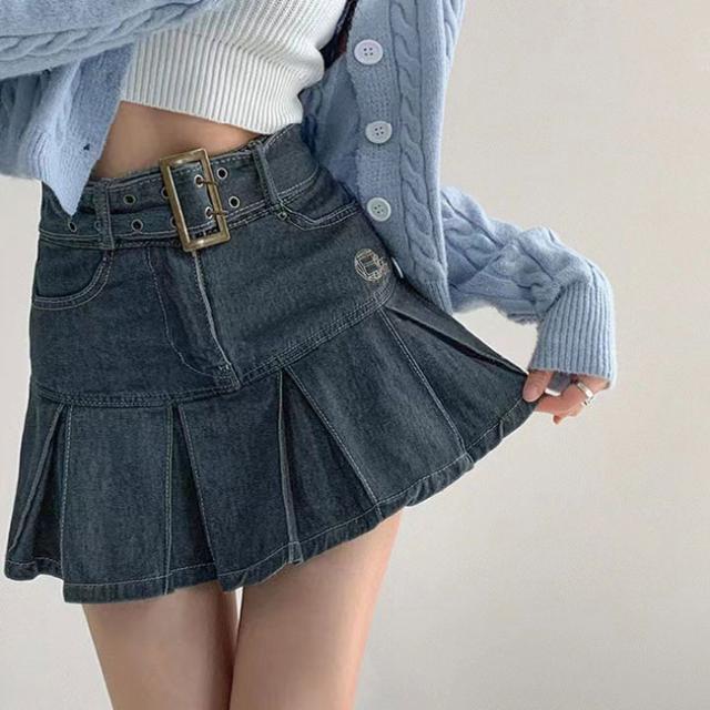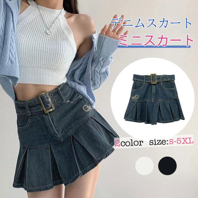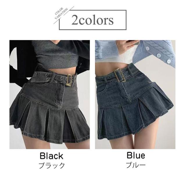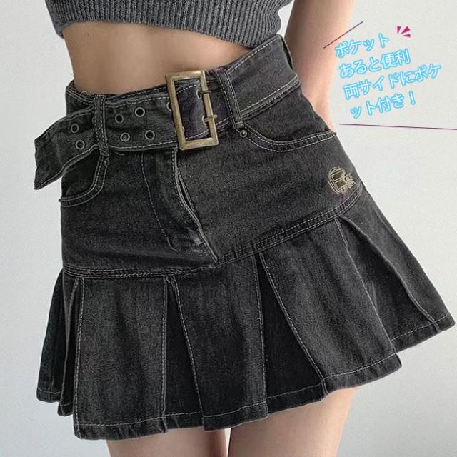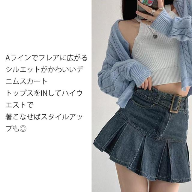 デニムスカート ミニスカート プリーツスカート ボトムス ベルト付き シンプル カジュアル お洒落 レディース おしゃれ かわいい