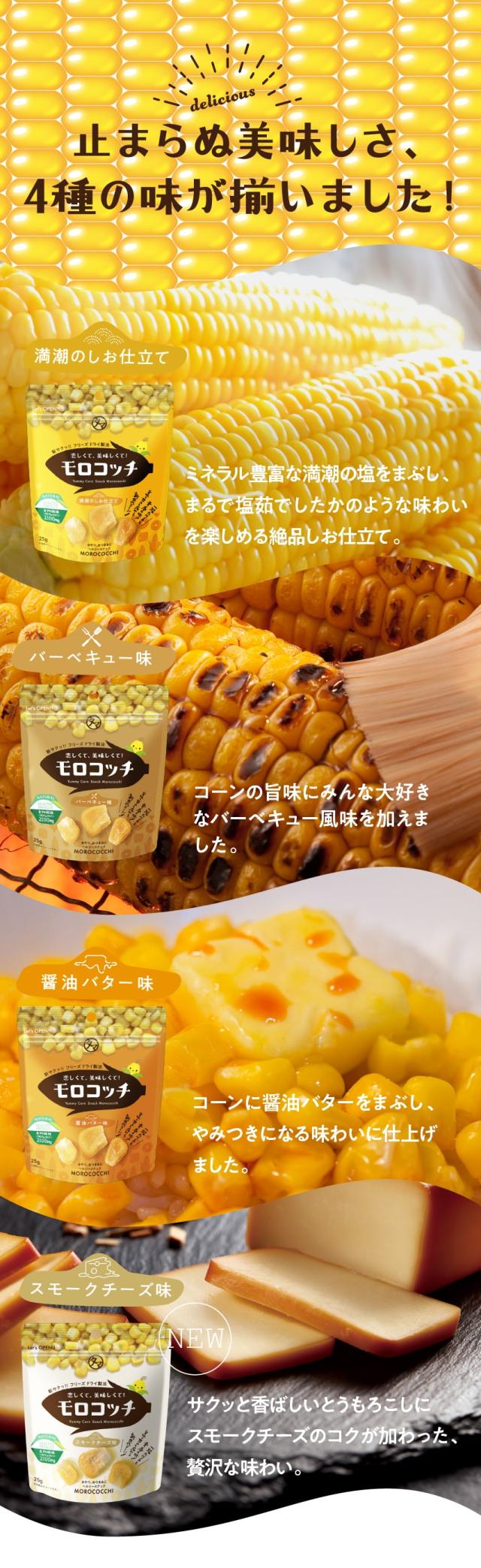 新食感!コーンスナック「モロコッチ」 (満潮のしお仕立て、バーベキュー味、醤油バター味、スモークチーズ味) 各25g とうもろこし トウモロコシ コーン スナック おやつ おつまみ フリーズドライ ヘルシー サステナブル 送料無料
