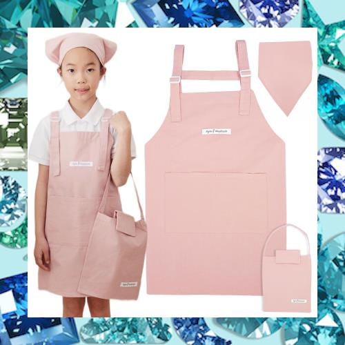 【サイズと素材】:素材:100%綿、肌触りが優しい。撥水加工も行われています。3色展開から選べ、2サイズで、幼稚園、小学校、中学校の子供に適しています。Sサイズ:56cm(着丈)×55cm(広げた時の幅),適用身長:120-140cm;Mサイズ:66cm(着丈)×64cm(広げた時の幅),適用身長:120-140cm;子供用三角巾(頭周):48cm~60cm 収納袋:24cm×28cm