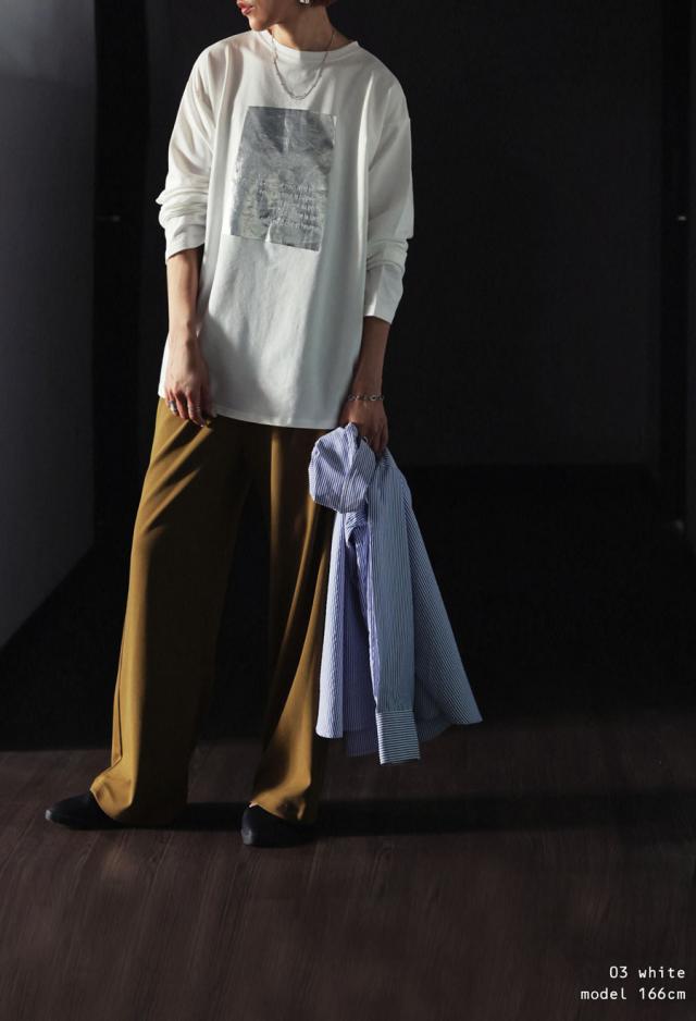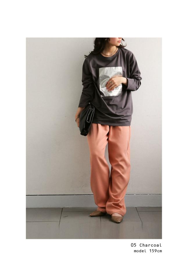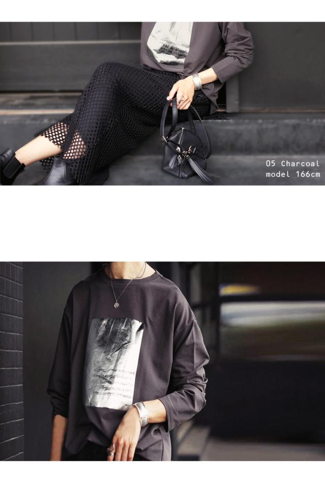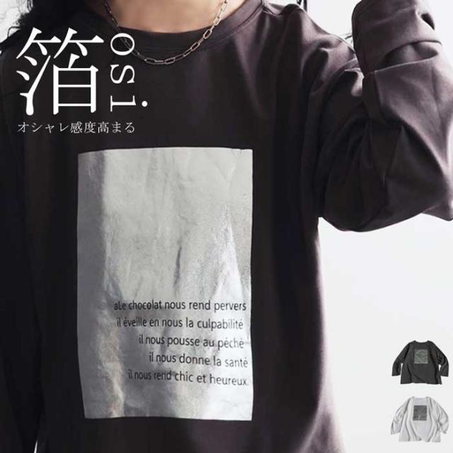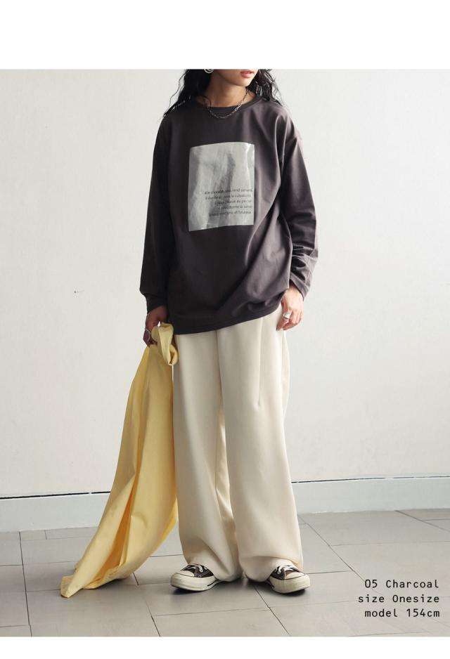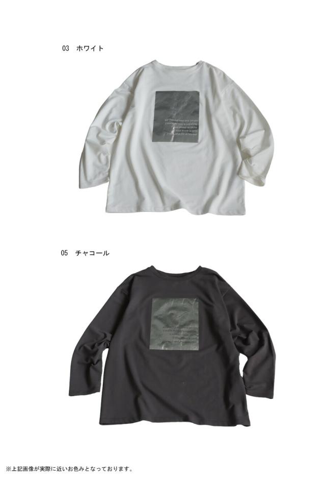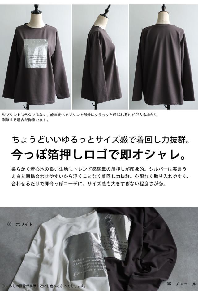 esa-00166 ロンT カットソー 長袖 丸首 プリント 箔押し ロゴ 綿混 ゆったり シンプル きれいめ 上品 モード 伸縮性 体型カバー 細見え 華奢見え 楽ちん 大きめ デザインTシャツ
