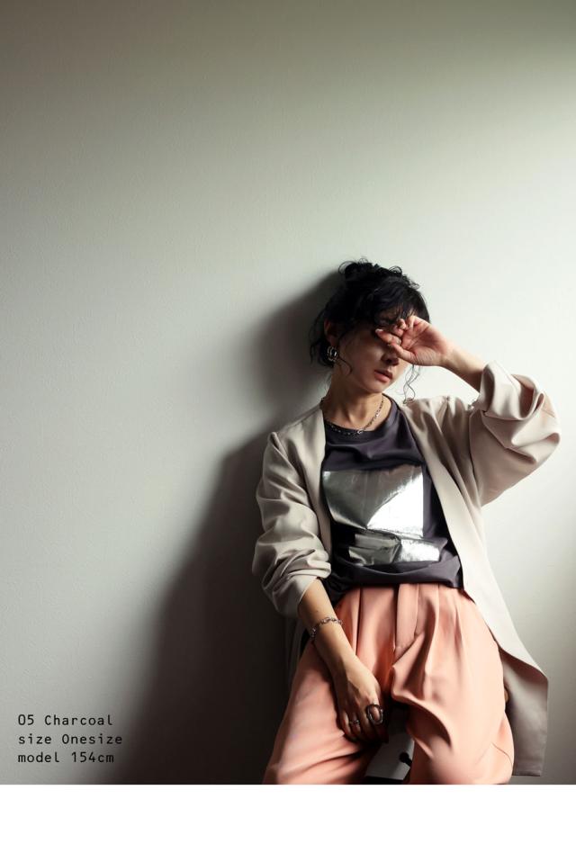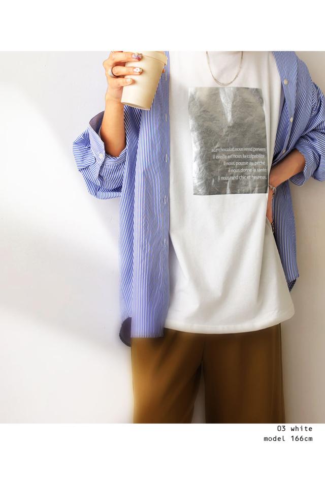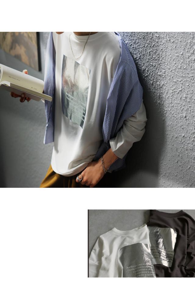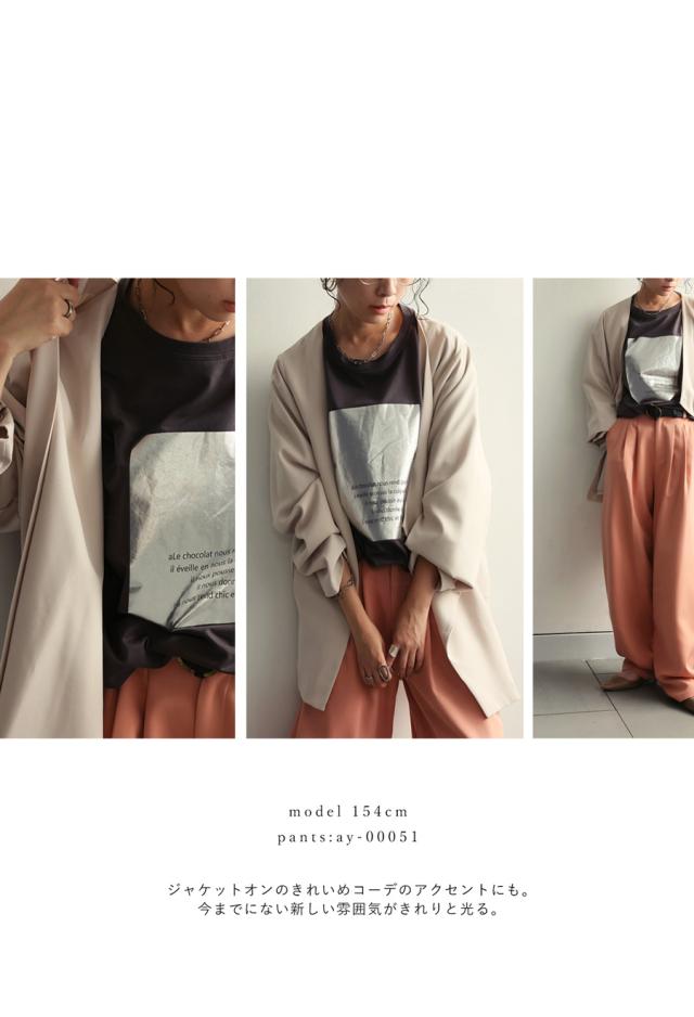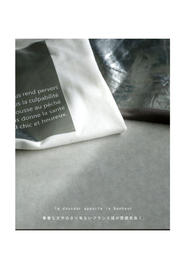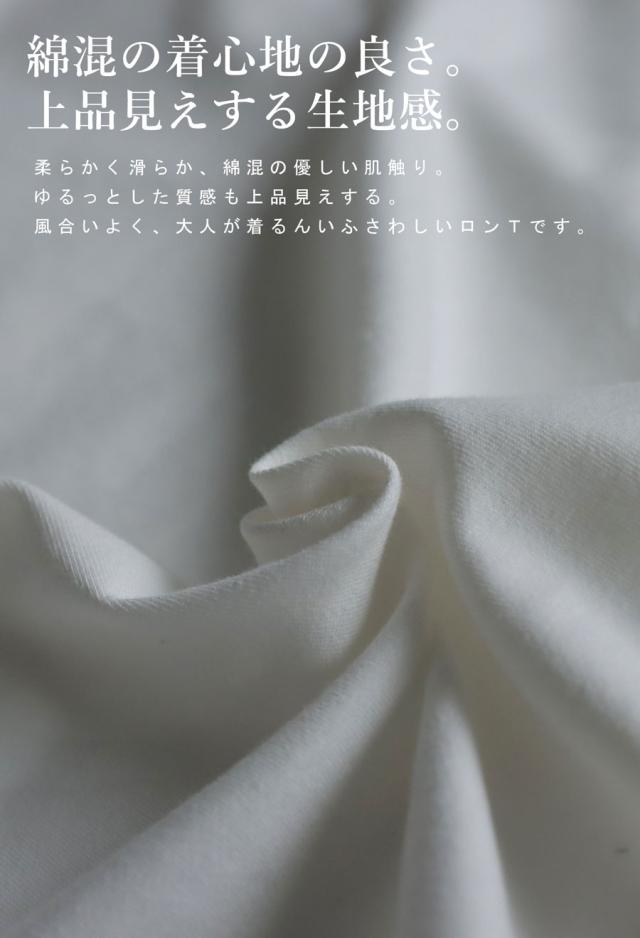 esa-00166 ロンT カットソー 長袖 丸首 プリント 箔押し ロゴ 綿混 ゆったり シンプル きれいめ 上品 モード 伸縮性 体型カバー 細見え 華奢見え 楽ちん 大きめ デザインTシャツ