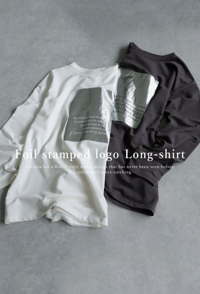 【検索ワード】箔プリントTシャツ Tシャツ レディース トップス ロンT カットソー 長袖 丸首 クルーネック プリント 箔押し ロゴ 英字 綿混 ゆったり シンプル きれいめ 上品 高級感 モード 伸縮性 ストレッチ 体型カバー 細見え 華奢見え 楽ちん 大きめ 大きいサイズ デザインTシャツ antiqua アンティカ 大人 おしゃれ 10代 20代 30代 40代 50代 60代 春 秋 冬 お洒落 カジュアル かわいい かっこいい あんてぃか