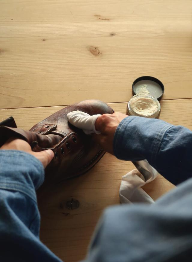 ブーツ片足につき、コーヒー豆粒程度のクリームを全体に薄くのばすように塗布してください。