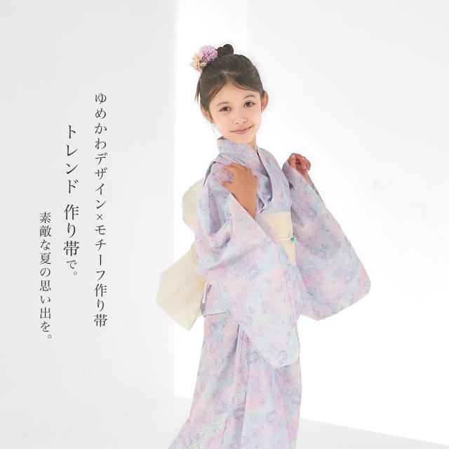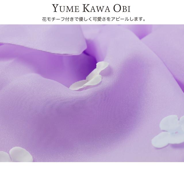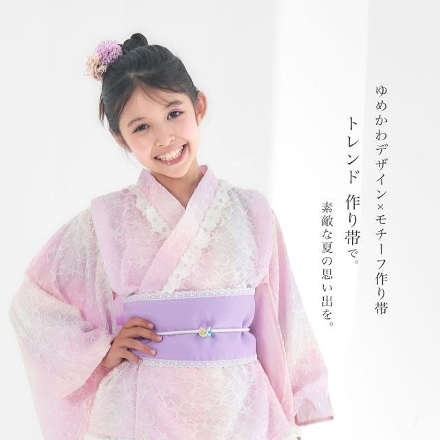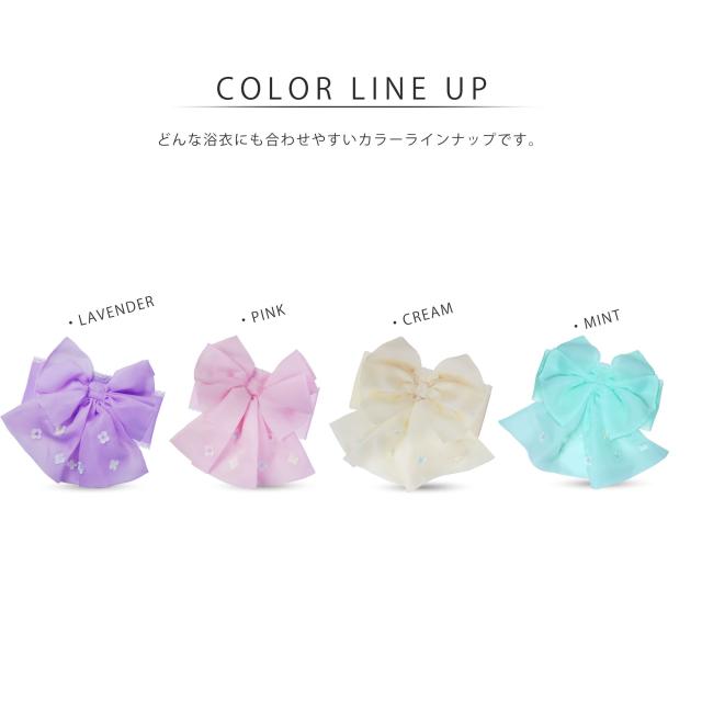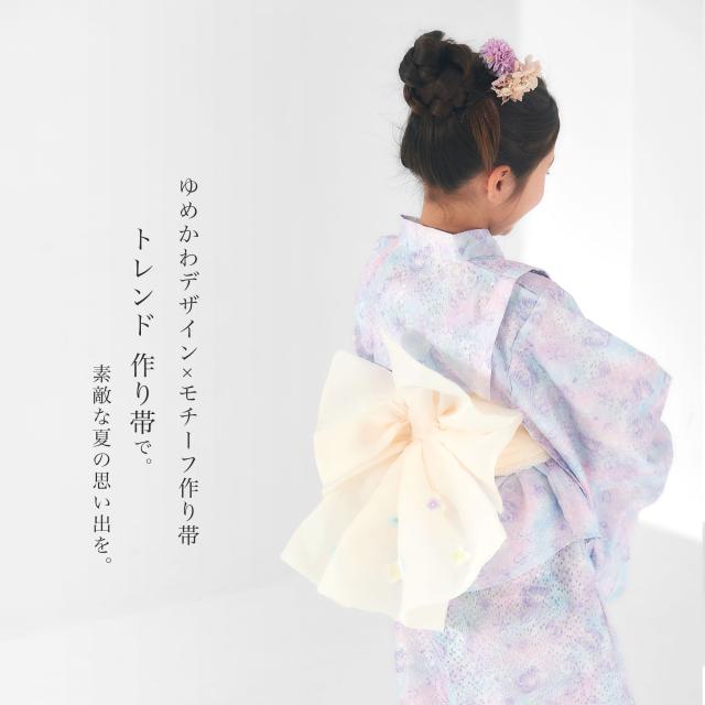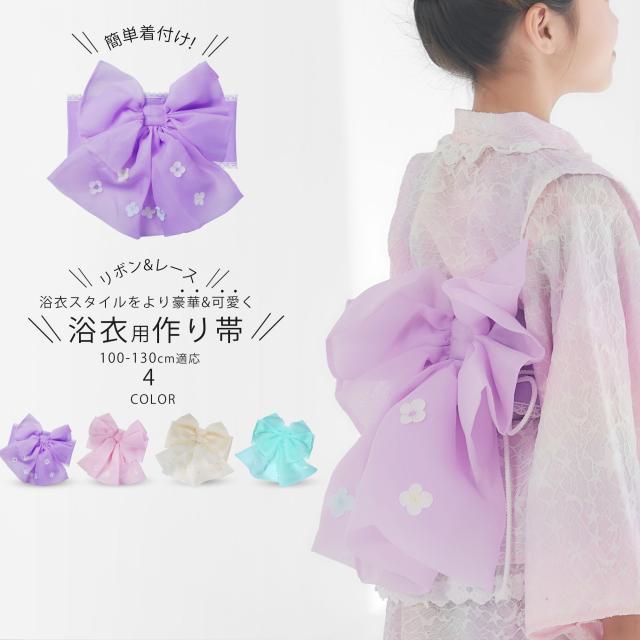 リボン&フラワーモチーフがかわいい 浴衣用 作り帯 兵児帯 選べる3色 黄色 クリーム ラベンダー 紫 ピンク