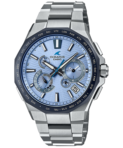 OCW-T6000BVは、日差しが反射して輝く海をデザインモチーフに採用。光の中で柔らかい表情を見せる海をライトブルー色で表現した特別なモデルです。