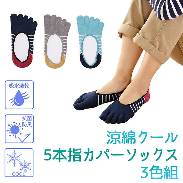 【3足組】フットカバー 涼綿クール 5本指 カバーソックス 3色組 2106230 接触冷感 冷感 キシリトール加工 冷感 夏 抗菌 防臭 吸水速乾 クール 三笠 MIKASA