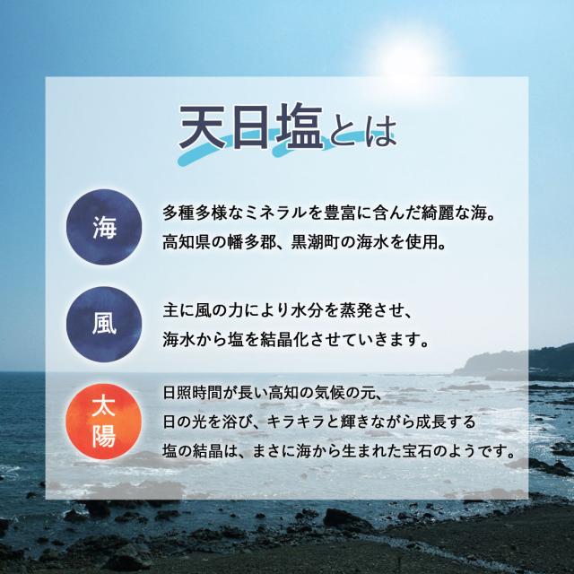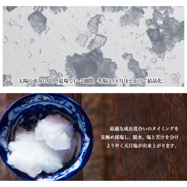 100kgの海水から数か月かけて出来上がる天日塩はわずか約1kgと、貴重な逸品になっています。