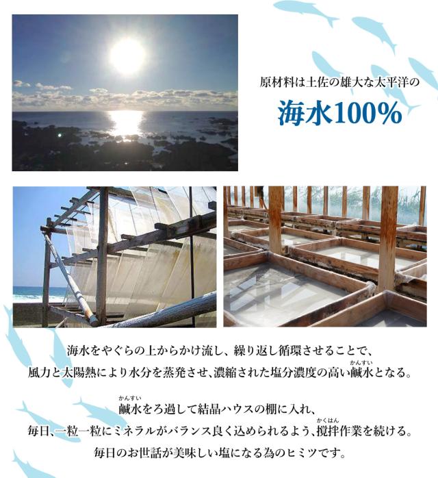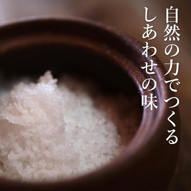 組み上げた海水を火力を一切使わず、太陽と風の力で水分を蒸発させ、ゆっくりと時間をかけて結晶化させたお塩。