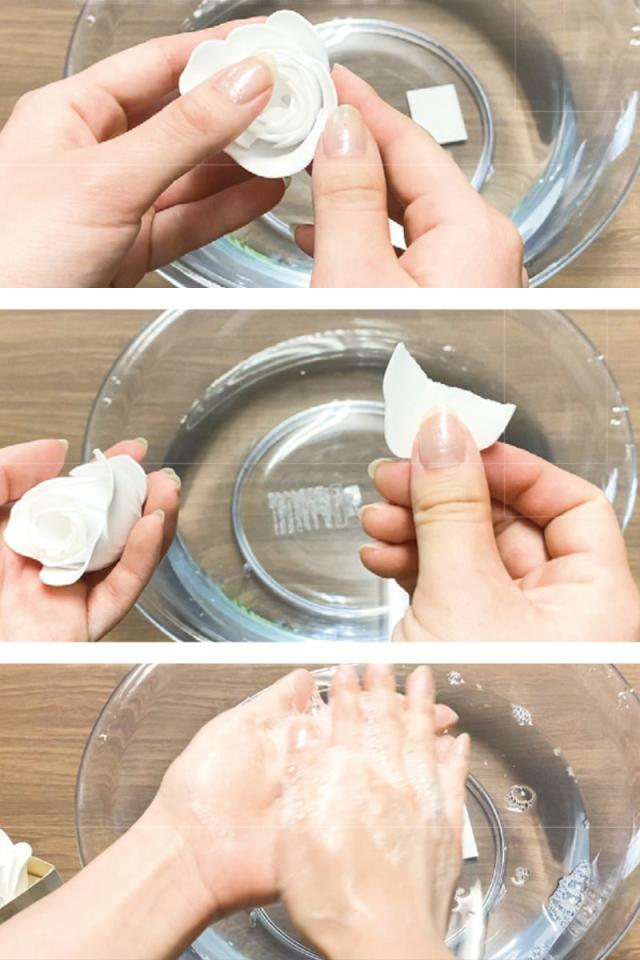 花びら一枚一枚が石けんになっています。花びらを半分使用し、水またはぬるま湯で泡立てて洗い、よくすすいでください。