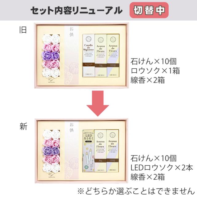 | 内容量 | 1箱 (石けん×10個、LEDローソク2本入り×1箱、線香×2箱) |