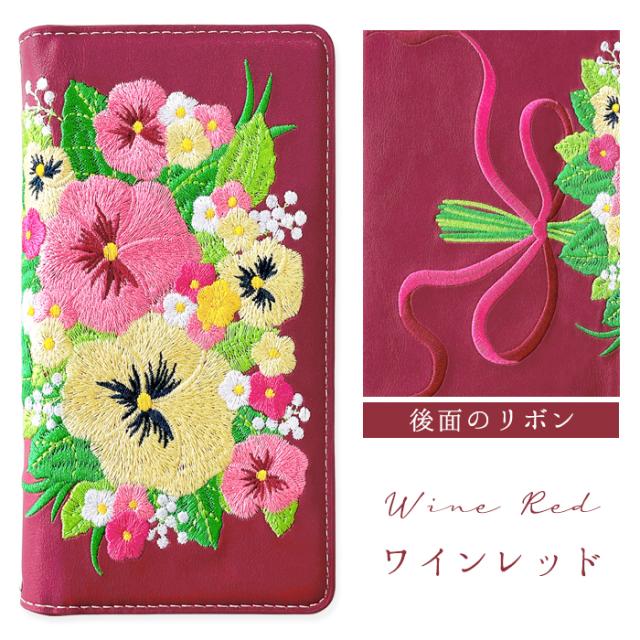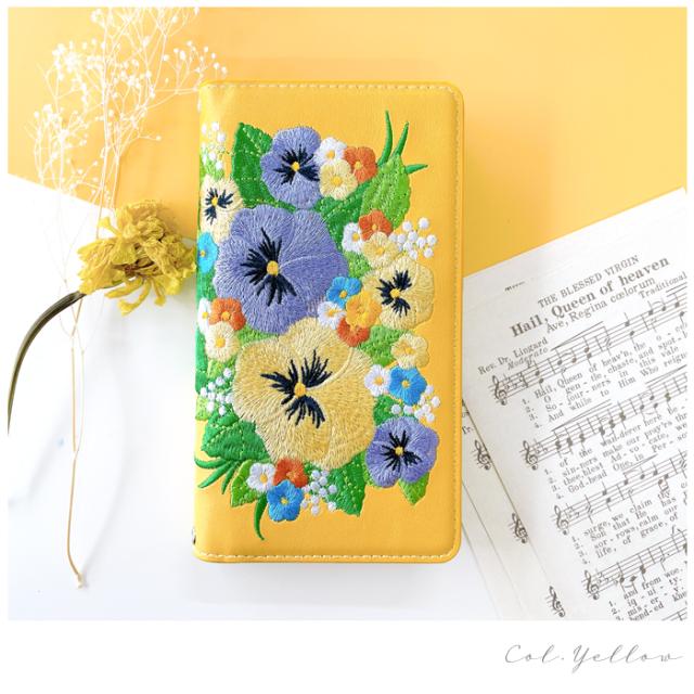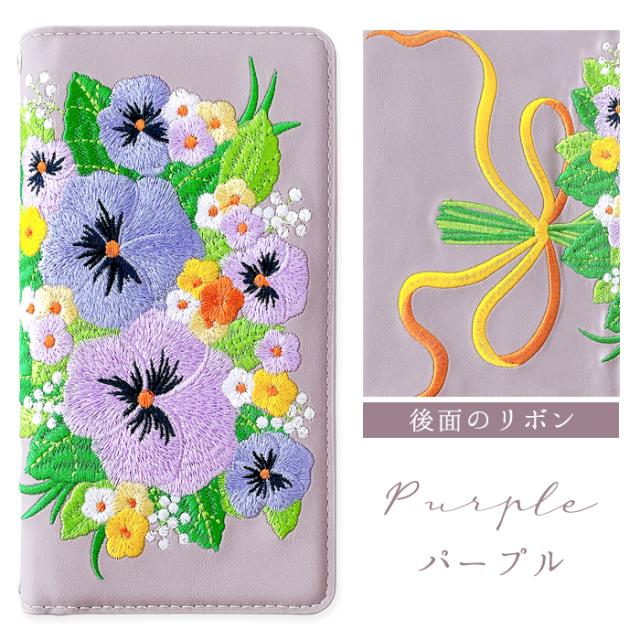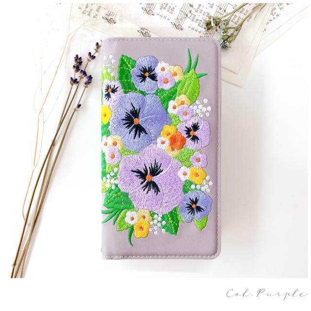 パンジー刺繍 手帳型ケース(内側:黒TPU ケース)
