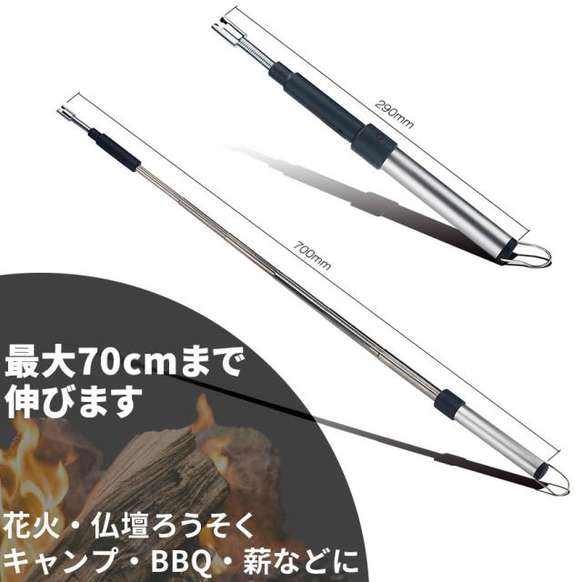 本体は約70cmまで伸縮し、先のほうはくねっと曲げれるので、ほしいところに火が届き安全にご使用できます。