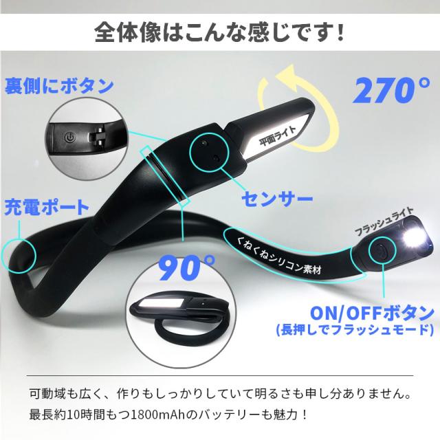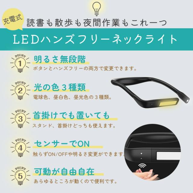 近くも遠くもこれ一つ♪ハンズフリーで操作できる「ネックライト」です!【使い道たくさんで自由自在!】読書、散歩、夜間作業、深夜のおむつ替え、懐中電灯、勉強、釣り、車の修理、キャンプやアウトドア等々、これ一つで使い道がたくさん!近くと遠くを照らせる2つのライトがついています。可動域も広くお好きな角度にすぐ調節可能です。もちろんスタンドとして置いても、ちょっと照らしたいときのライトとしても用途多彩で自由に使えます♪【無段階調光&3色】環境に合わせて細かく明るさ調節可能です。また、3色の色の変更もできるので、優しくオレンジに、しっかり白で明るく、またその中間で、と簡単に変更できます。