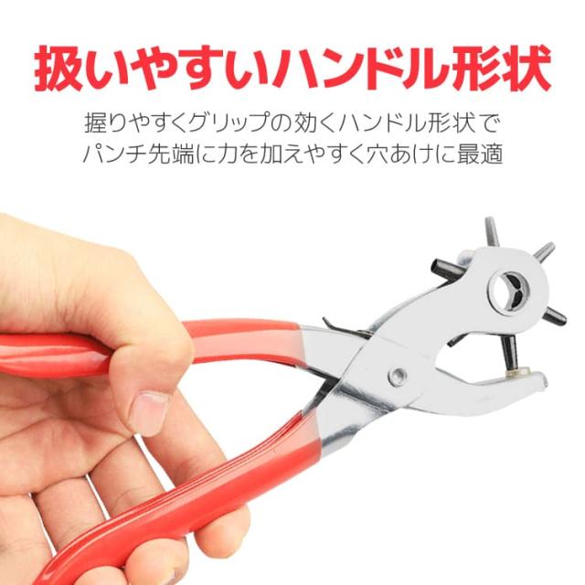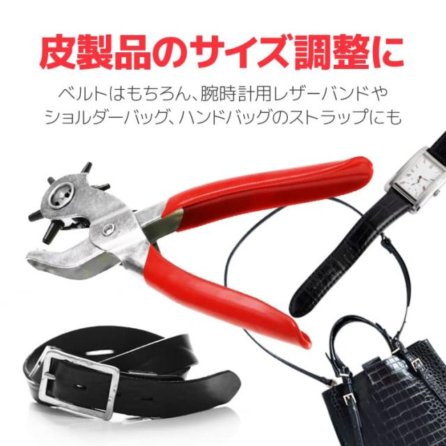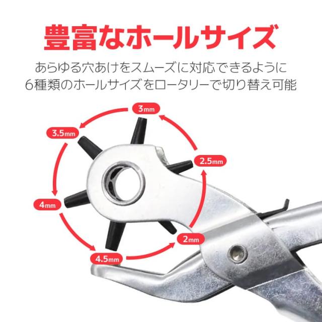 2mm/2.5mm/3mm/3.5mm/4mm/4.5mmと6種類の大きさの穴あけに対応しているので、ベルトはもちろん、腕時計用レザーバンドやショルダーバッグ、ハンドバッグのストラップなど幅広い革製品のサイズ調整に役立ちます。