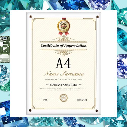 A4 賞状、認定証、写真、雑誌の切り抜き、絵画、はがき、資格の認定証、切り絵や作品を綺麗に展示、保管することが可能。メッセージボードや展示会の資料、お店の看板としてもご利用いただいております。
